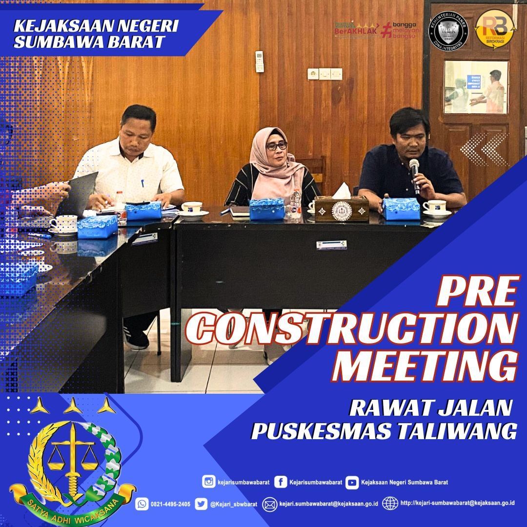 Pada hari Jum’at, 23 Agustus 2024. Kepala Seksi Perdata dan TUN, Reza Safetsila Yusa, SH menghadiri Rapat Pre Construction Meeting Rehabilitasi Rawat Jalan Puskesmas Taliwang Dinas Kesehatan Kabupaten Sumbawa Barat Tahun Anggaran 2024 yang bertempat di Ruang Rapat Dinas Kesehatan Kabupaten Sumbawa Barat.