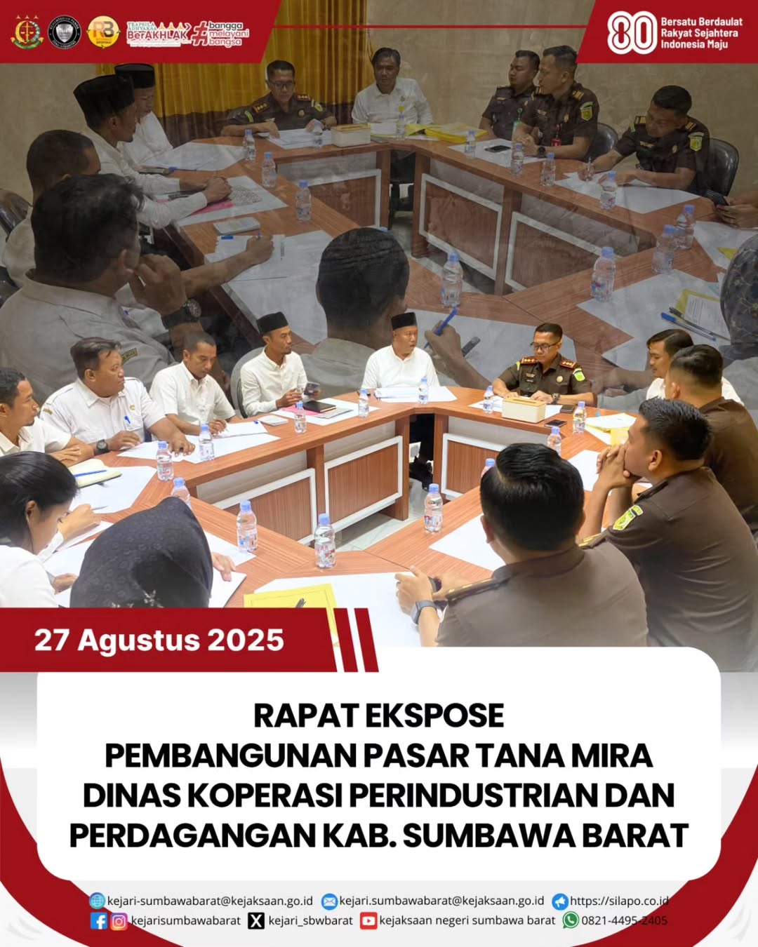 Pada hari Rabu, 27 Agustus 2025. Kepala Kejaksaan Negeri Sumbawa Barat Bapak Agung Pamungkas, SH., MH didampingi oleh Kasi Perdata dan TUN Kejari Sumbawa Barat Reza Safetsila Yusa, SH beserta tim Jaksa Pengacara Negara melaksanakan rapat ekspose Pembangunan Pasar Tana Mira okeh Dinas Koperasi Perindustrian dan Perdagangan Kab. Sumbawa Barat di Ruang Rapat Kajari Sumbawa Barat.