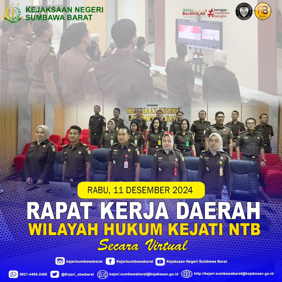 Pada hari Rabu, 11 Desember 2024. Para Kasi dan Pegawai Kejaksaan Negeri Sumbawa Barat mengikuti Rapat Kerja Daerah (Rakerda) Tahun 2024 secara virtual bertempat di Ruang Vidcon Kejari Sumbawa Barat.
