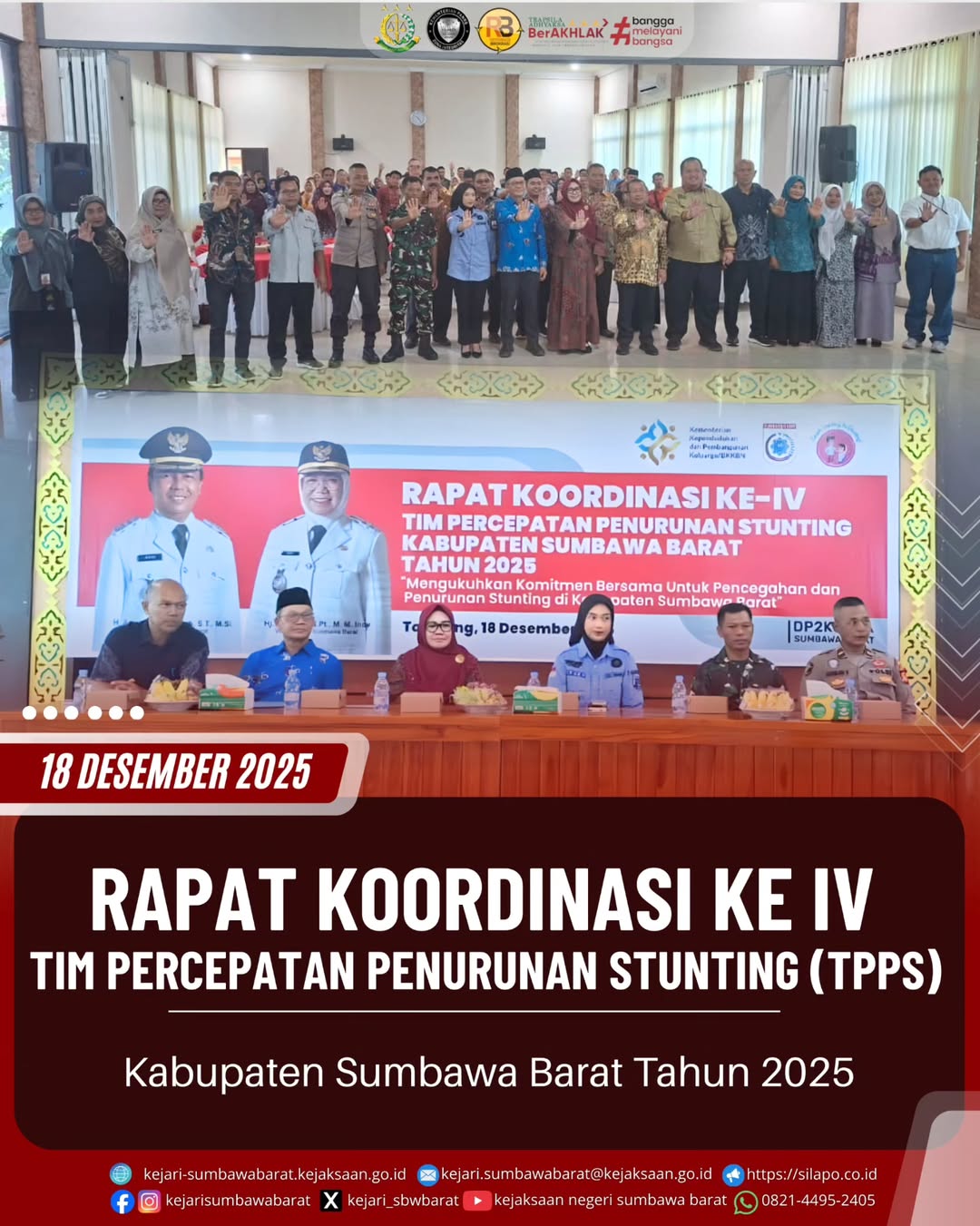Pada hari Kamis, 18 Desember 2025. Pemerintah Kab. Sumbawa Barat melalui DP2KBP3A Kab. Sumbawa Barat melaksanakan kegiatan Rapat Koordinasi ke-4 terkait Tim Percepatan Penurunan Stunting (TPPS) Kab. Sumbawa Barat Tahun 2025 yang dipimpin langsung oleh Wakil Bupati Sumbawa Barat Ibu Hj. Hanipati, S.Pt., MM. Inov.