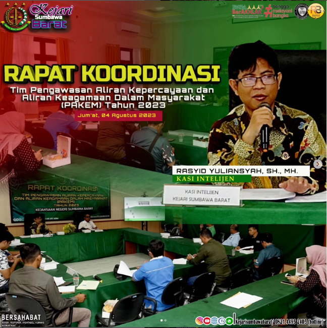 Kejaksaan Negeri Sumbawa Barat melalui bidang Intelijen melaksanakan kegiatan Rapat Koordinasi Tim Pengawasan Aliran Kepercayaan dan Aliran Keagamaan dalam Masyarakat (PAKEM) tahun 2023 di Aula Kantor Kejaksaan Negeri Sumbawa Barat.