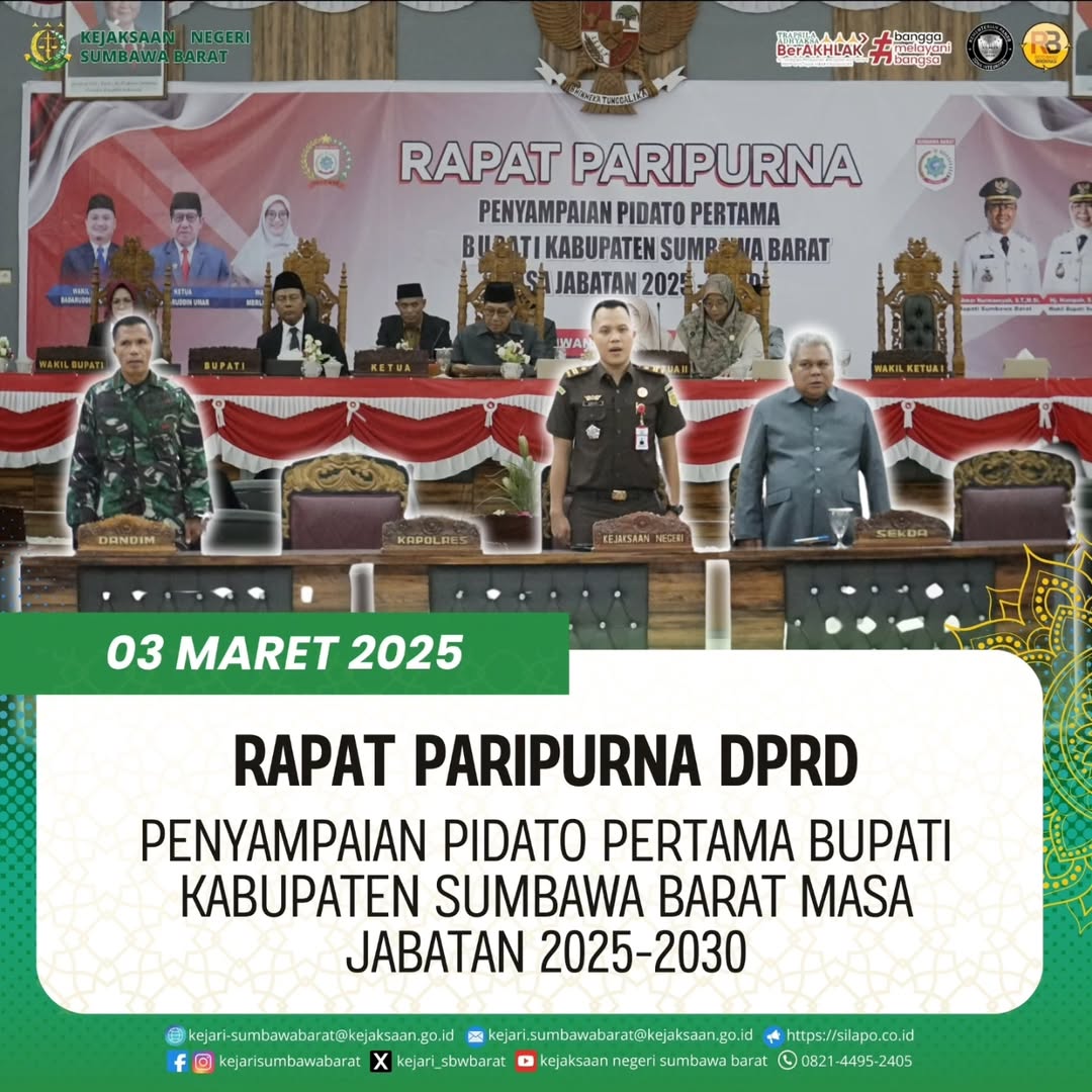 Pada hari Senin, tanggal 03 Maret 2025, bertempat di Ruang Sidang Utama DPRD Kabupaten Sumbawa Barat Kepala Seksi PAPBB, Andri Setiawan, SH mewakili Kepala Kejaksaan Negeri Sumbawa Barat dalam acara Rapat Paripurna DPRD Kabupaten Sumbawa Barat dengan agenda Pidato Awal Bupati Terpilih Masa Jabatan 2025 – 2030.