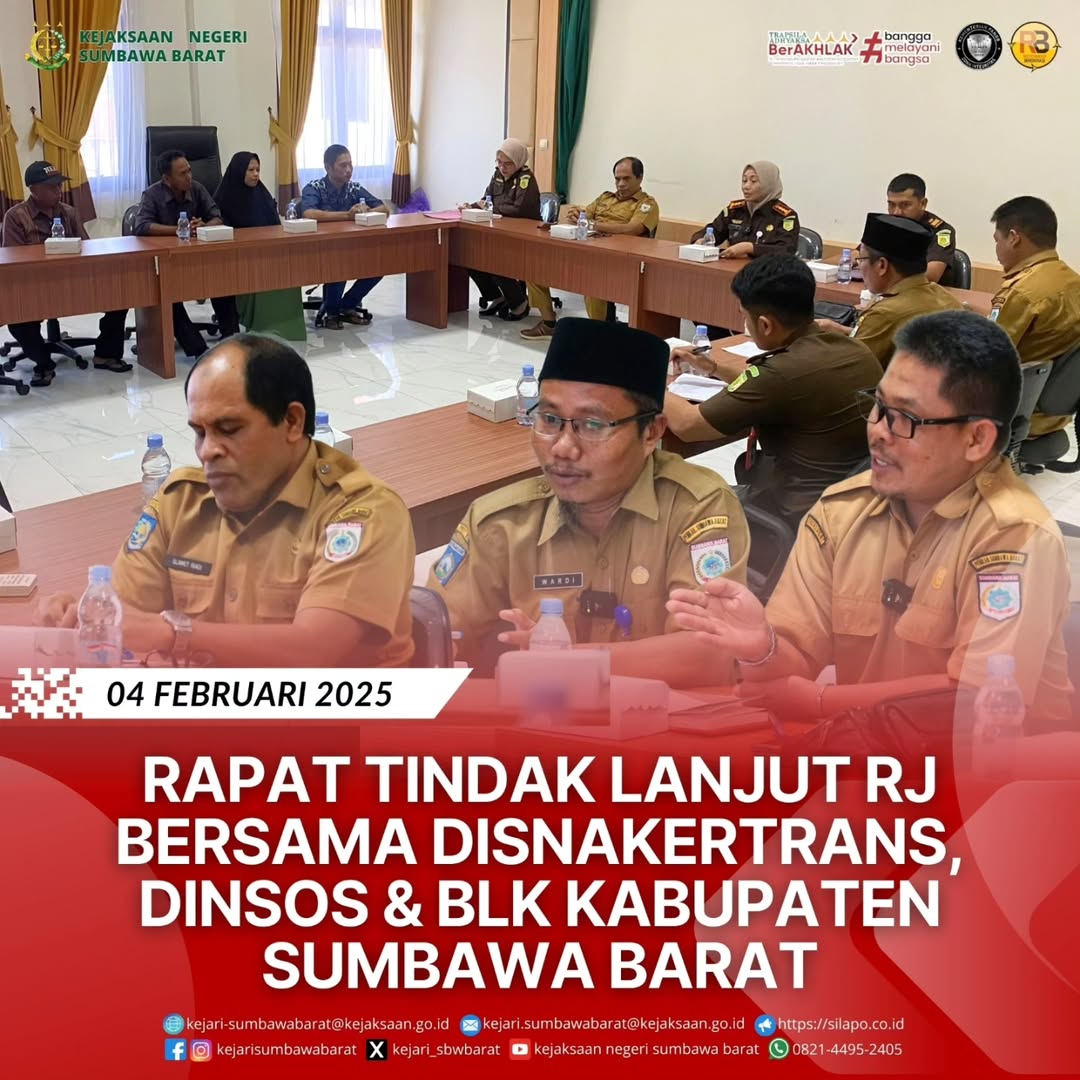 Pada hari Selasa, 04 Februari 2025. Kepala Kejaksaan Negeri Sumbawa Barat, Dr. Titin Herawati Utara, SH.,MH memimpin rapat bersama Disnakertrans, Dinas Sosial, dam BLK Kab. Sumbawa Barat dalam rangka paska pelaksanaan restiratif justice yang telah disetujui oleh Jaksa Agung Muda Tindak Pidana Umum.