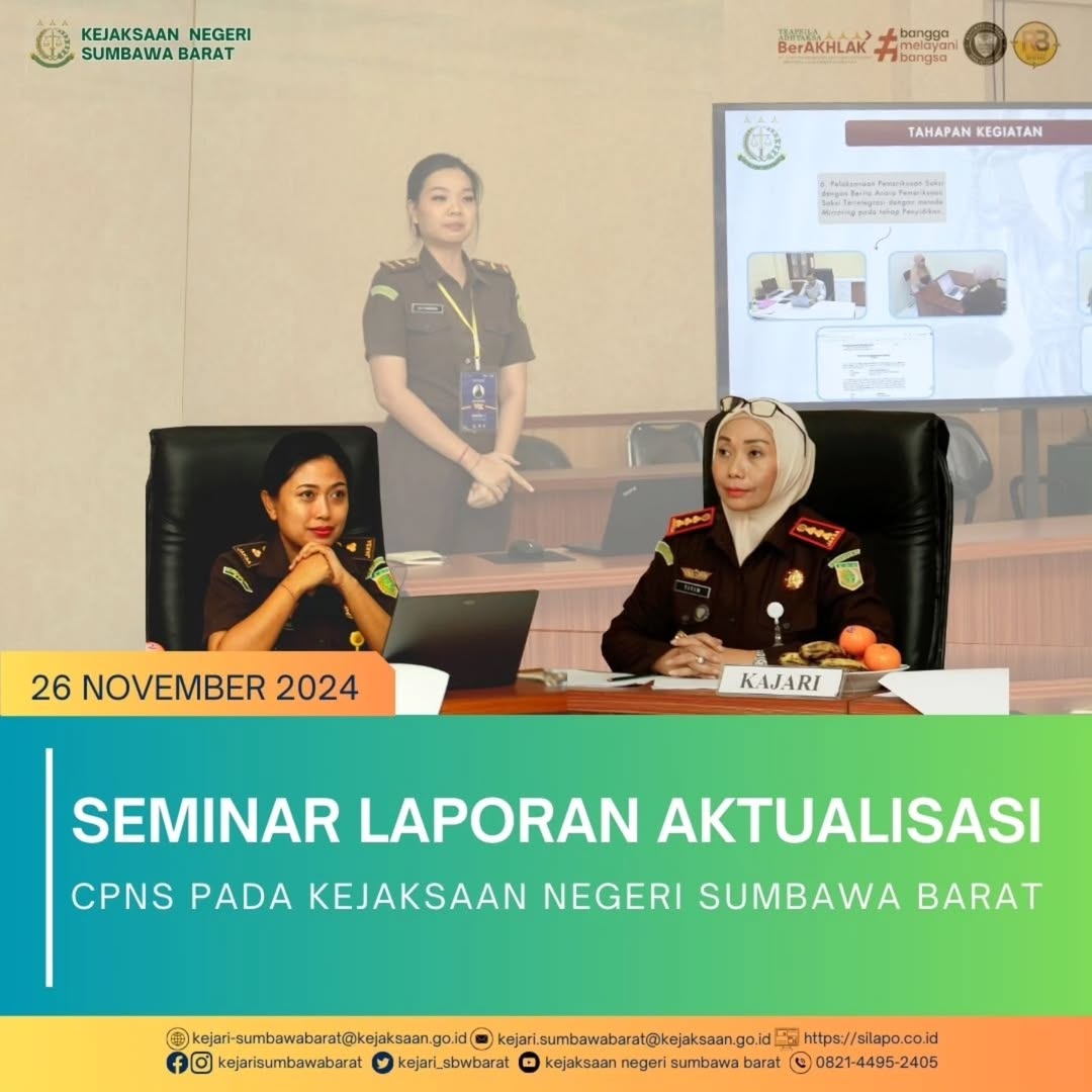 Pada hari Selasa tanggal 26 November 2024 bertempat di Aula Kejaksaan Negeri Sumbawa Barat telah dilaksanakan Seminar Laporan Aktualisasi Calon Pegawai Negeri Sipil (CPNS) Golongan II dan Golongan III Tahun 2024 pada Kejaksaan Negeri Sumbawa Barat. Seminar dihadiri oleh Kepala Kejaksaan Negeri Sumbawa Barat, Dr. Titin Herawati Utara, SH.,MH., yang bertindak selaku Penguji dan Kepala Sub Bagian Pembinaan, Ida Ayu Putu Camundi Dewi, SH selaku Mentor.
