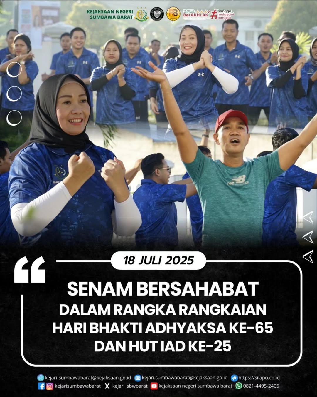 Pada hari Jum’at, 18 Juli 2025. Kejaksaan Negeri Sumbawa Barat melaksanakan senam bersahabat dalam rangka Hari Bhakti Adhyaksa ke-65 dan HUT Ikatan Adhyaksa Dharmakarini Ke-25. Kegiatan tersebut dilaksanakan di Halaman Kantor Kejaksaan Negeri Sumbawa Barat diikuti oleh seluruh pegawai Kejari Sumbawa Barat dan Anggota IAD Daerah Sumbawa Barat.