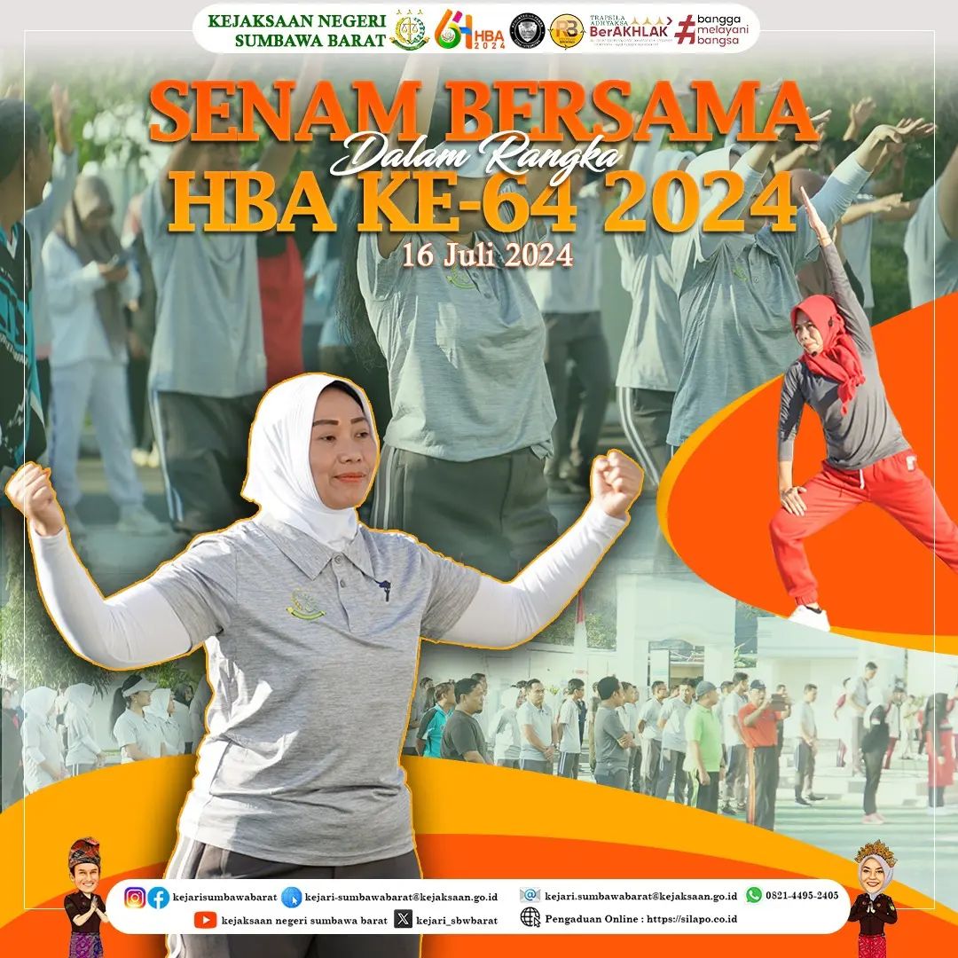 Kejaksaan Negeri Sumbawa Barat bersama Forkopimda Kab. Sumbawa Barat dan OPD Kab. Sumbawa Barat melaksanakan senam pagi pada hari Rabu, 17 Juli 2024 bertempat di halaman Kantor Kejari Sumbawa Barat dalam rangka Hari Bhakti Adhyaksa Ke-64.