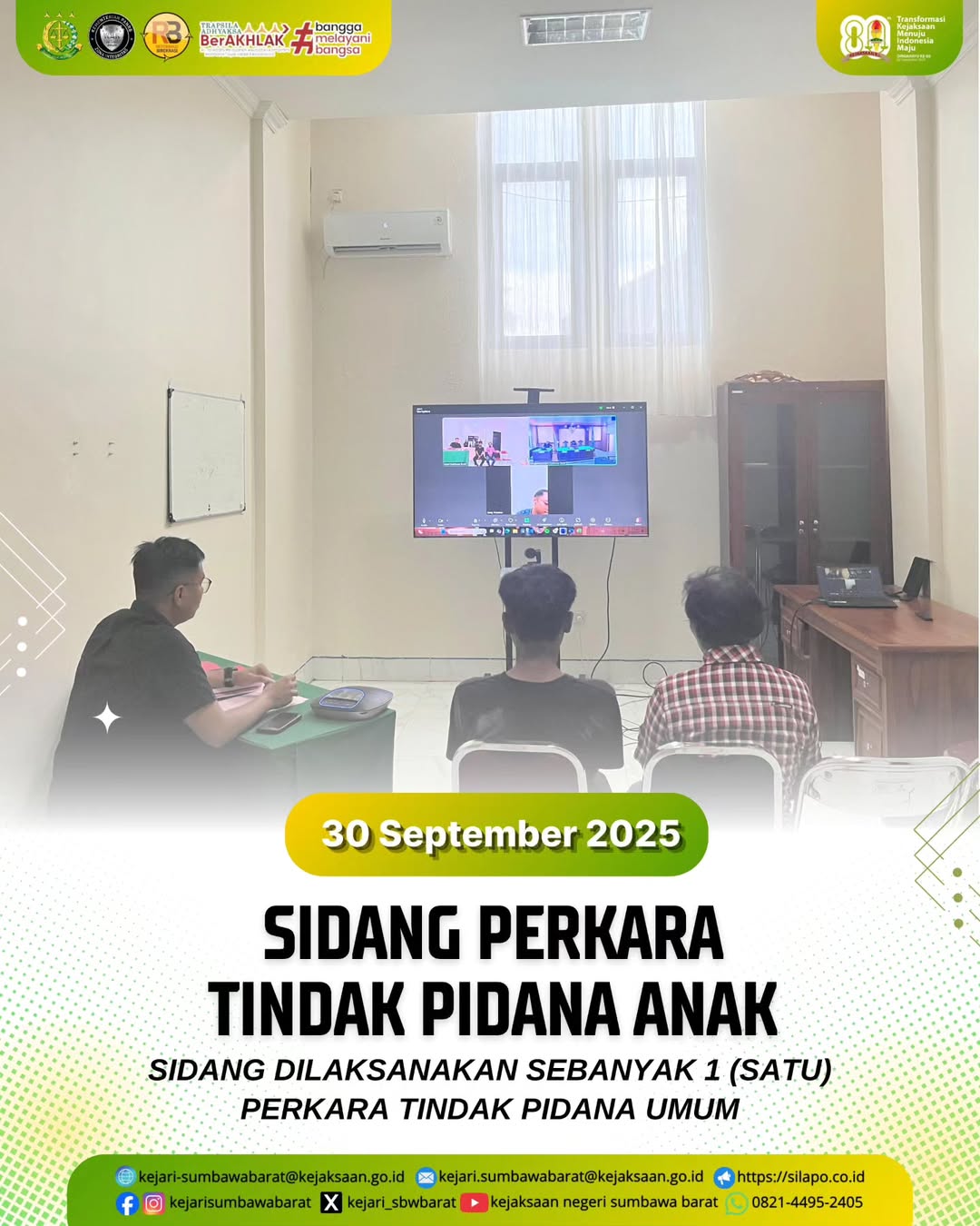 Pada hari Selasa, 30 September 2025. Tim Jaksa pada Kejaksaan Negeri Sumbawa barat melaksanakan Sidang Tindak Pidana Anak yang dipimpin langsung oleh Pengadilan Negeri Sumbawa Besar sebanyak 1 perkara.