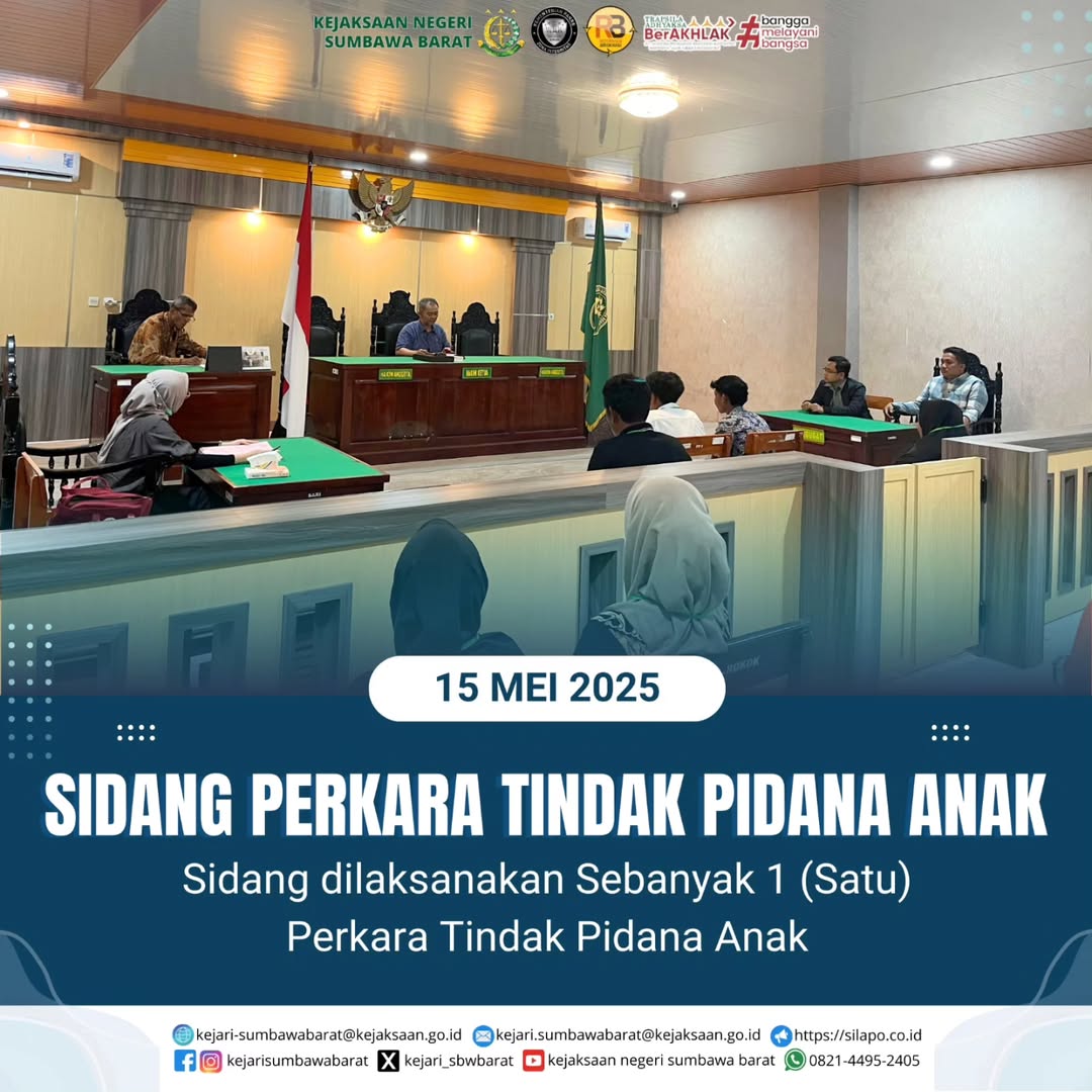 Pada hari Kamis tanggal 15 Mei 2025, JPU pada Kejaksaan Negeri Sumbawa Barat telah melaksanakan sidang pertama sebanyak 1 (satu) Perkara Pidana Anak. Sebelum masuk pada agenda pembacaan surat dakwaan, telah dilaksanakan upaya Diversi terlebih dahulu.