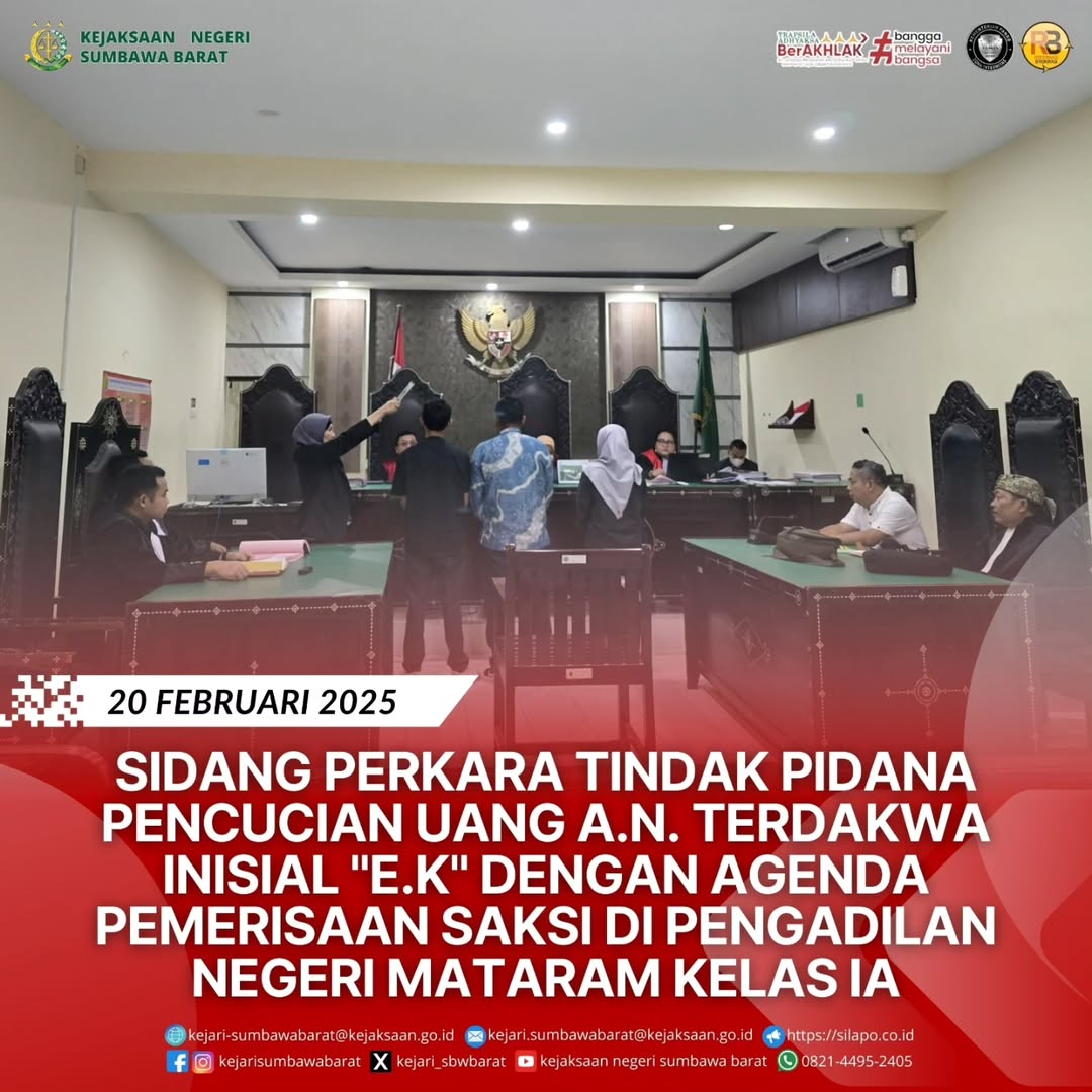 Pada hari Kamis, 20 Februari 2025. JPU pada Kejaksaan Negeri Sumbawa Barat melaksamakan sidang Perkara Tindak Pidana Pencucian Uang (TPPU) atas nama terdakwa Inisial “EK” dengan Agenda Pemerisaan Saksi di Pengadilan Negeri Mataram Kelas IA
