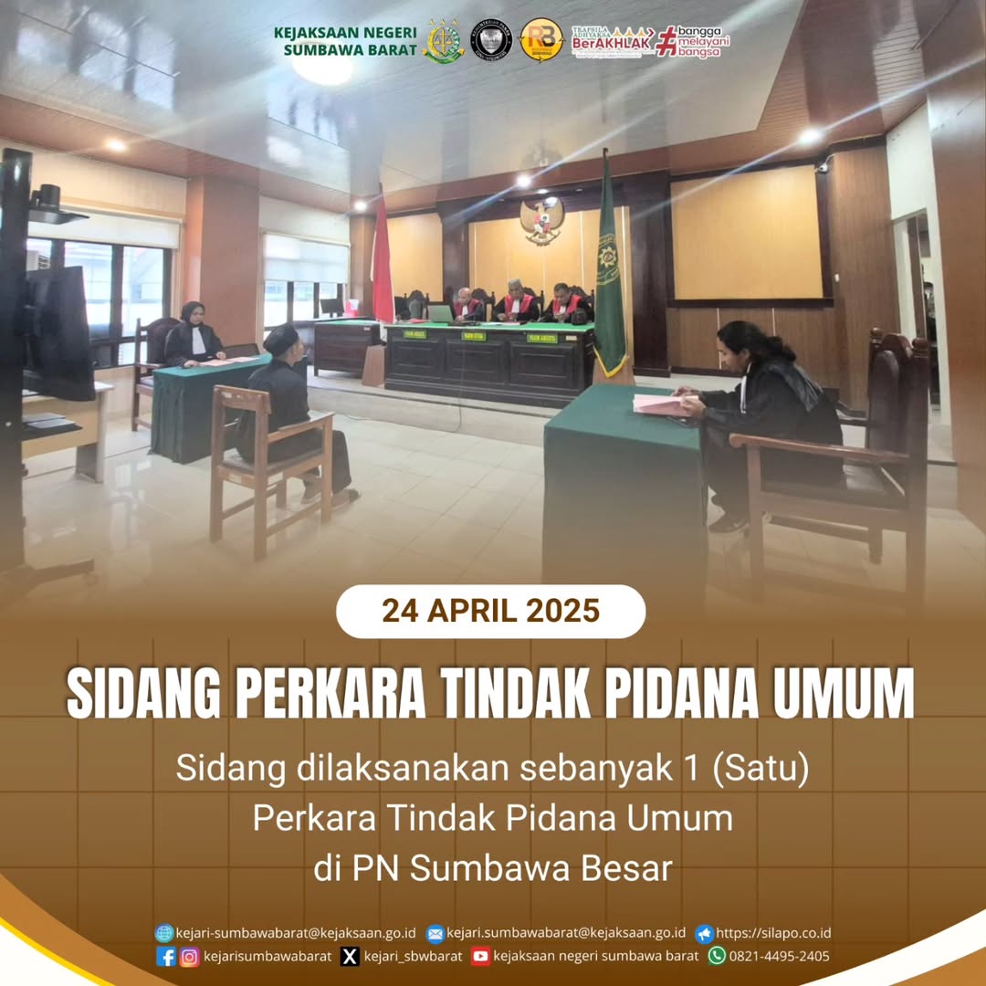 pada hari Kamis 24 April 2025. JPU pada Kejari Sumbawa Barat telah melaksanakan sidang tindak pidana umum sebanyak 1 (satu) perkara pidana bertempat di Pengadilan Negeri Sumbawa.