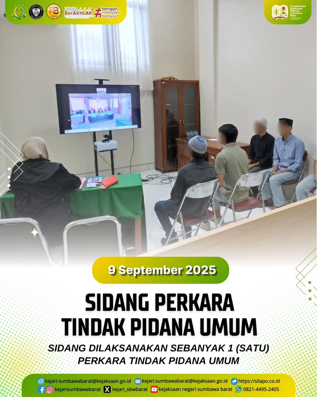 Pada hari Selasa, 9 September 2025. Tim Jaksa pada Kejaksaan Negeri Sumbawa barat melaksanakan Sidang Tindak Pidana Umum yang dipimpin langsung oleh Pengadilan Negeri Sumbawa Besar sebanyak 1 perkara.