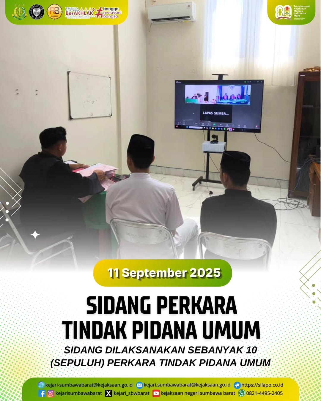 Pada hari Kamis, 11 September 2025. Tim Jaksa pada Kejaksaan Negeri Sumbawa barat melaksanakan Sidang Tindak Pidana Umum yang dipimpin langsung oleh Pengadilan Negeri Sumbawa Besar sebanyak 10 perkara.