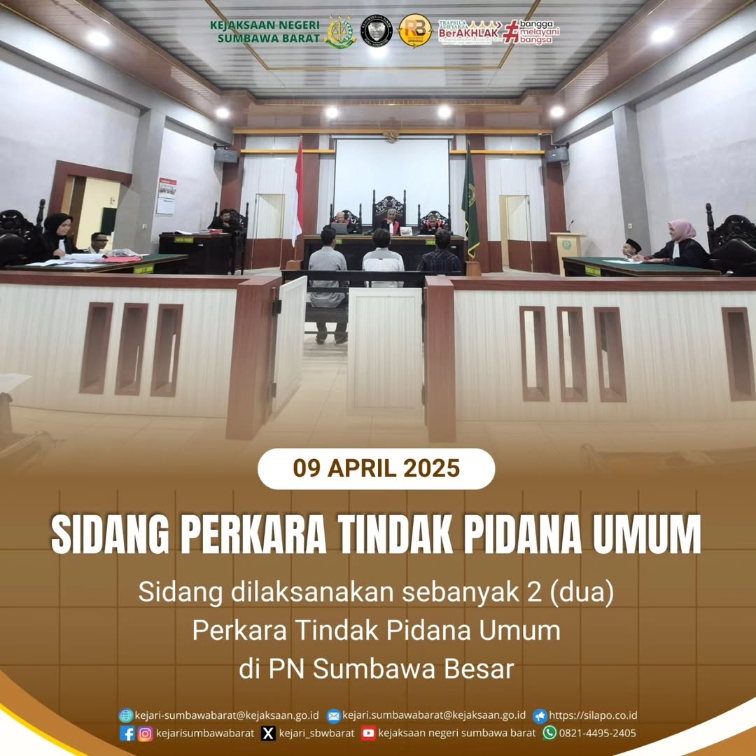 Pada hari Rabu, 09 April 2025. JPU pada Kejaksaan Negeri Sumbawa Barat melaksanakan sidang perkara tindak pidana umum sejumlah 2 (dua) perkara yang dilaksanakan secara offline di Pengadilan Negeri Sumbawa.