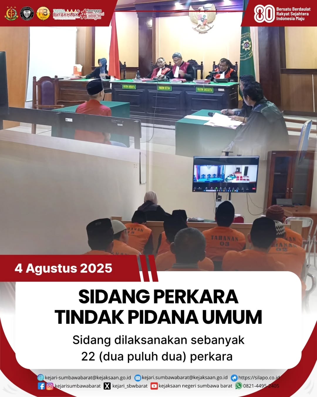 Pada Hari Senin, 4 Agusutus 2025. Telah dilaksanakan sidang perkara tindak pidana umum oleh Jaksa Penuntut Umum (JPU) Kejaksaan Negeri Sumbawa Barat yang dilakukan secara daring maupun luring.