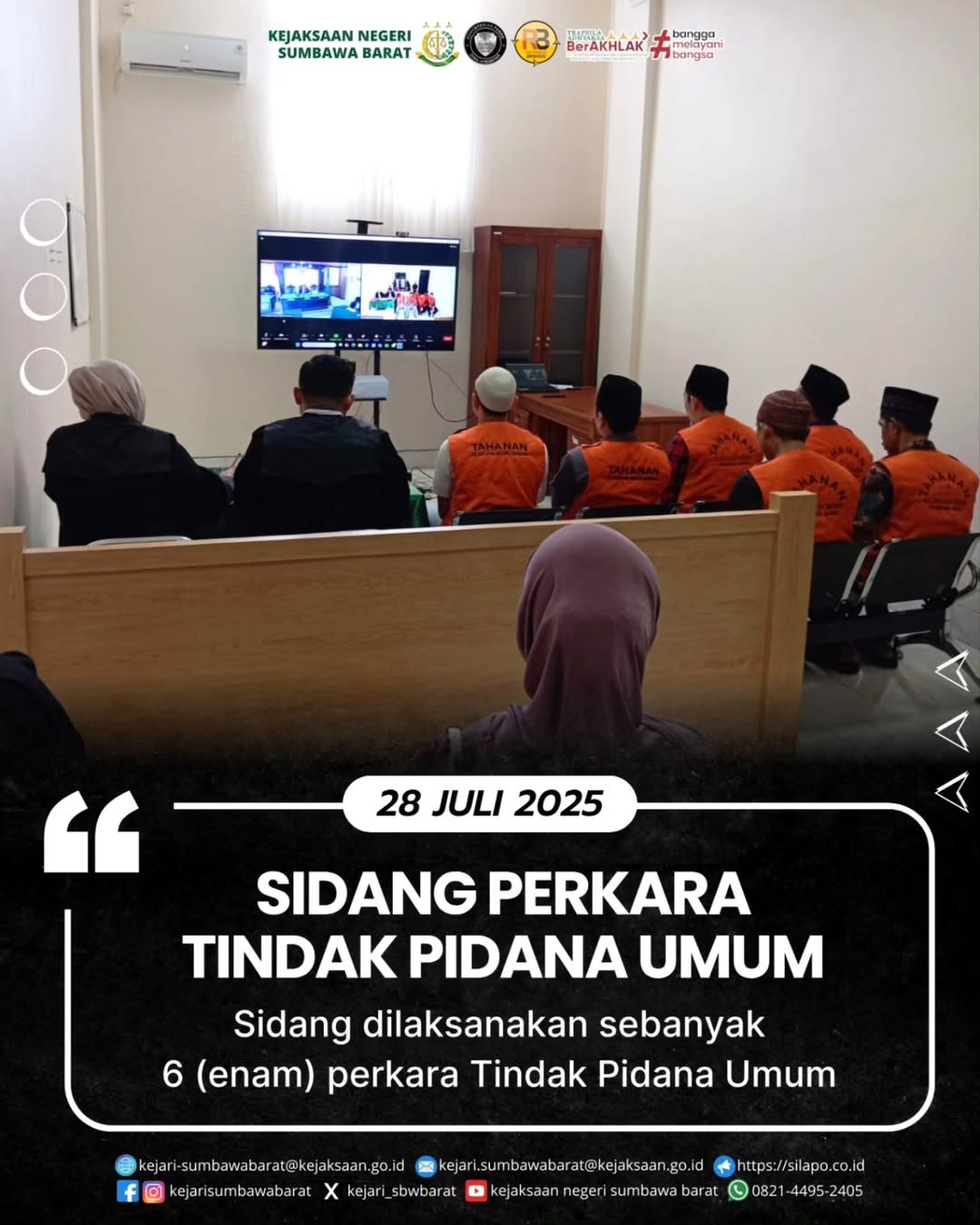 Pada hari Senin, 28 Juli 2025.Sebanyak 6 (enam) perkara tidak pidana umum telah dilakukan Sidang secara online pada ruang sidang Kantor Kejaksaan Negeri Sumbawa Barat oleh Jaksa Penuntut Umum pada Kejaksaan Negeri Sumbawa Barat.