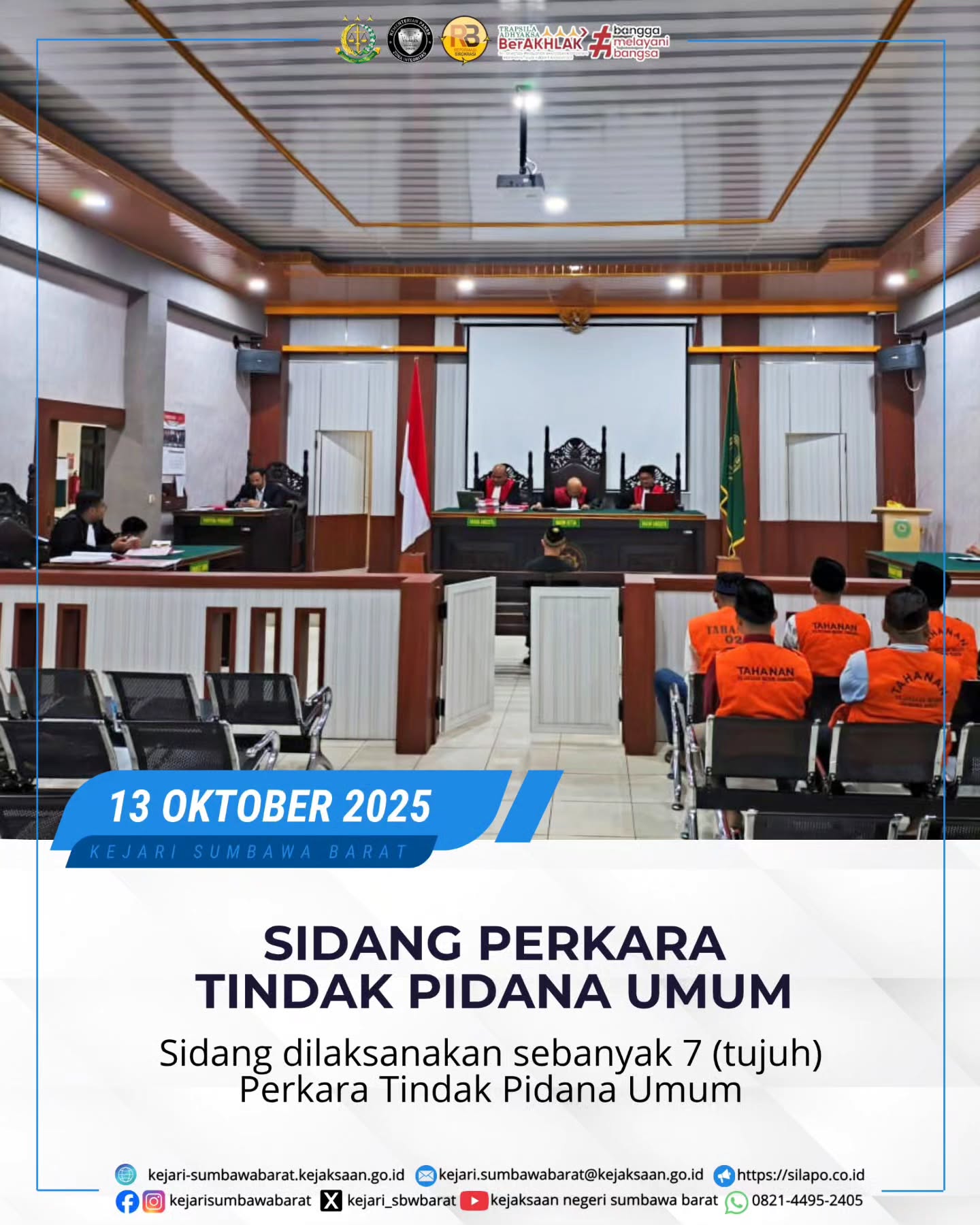 Pada hari Senin, 13 Oktober 2025. Tim Jaksa pada Kejaksaan Negeri Sumbawa barat melaksanakan Sidang Tindak Pidana Umum yang dipimpin langsung oleh Pengadilan Negeri Sumbawa Besar sebanyak 7 (tujuh) perkara.
