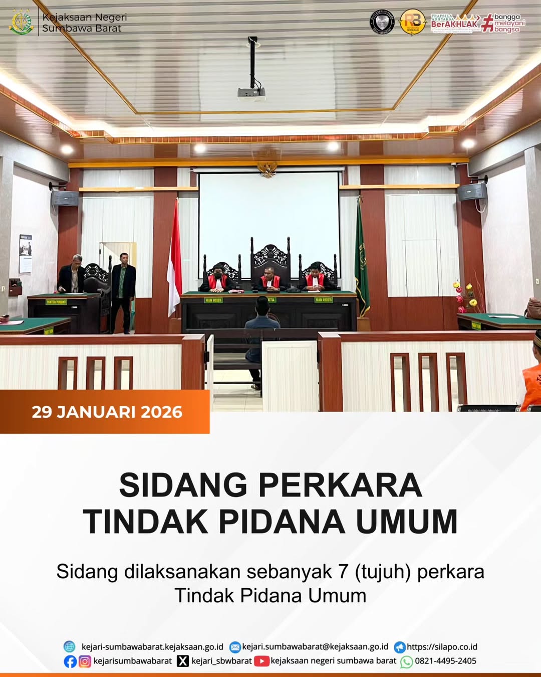 Pada hari Kamis, 29 Januari 2026. Tim Jaksa pada Kejaksaan Negeri Sumbawa barat melaksanakan Sidang Tindak Pidana Umum yang dipimpin langsung oleh Pengadilan Negeri Sumbawa Besar sebanyak 7 (tujuh) perkara Tindak Pidana Umum
