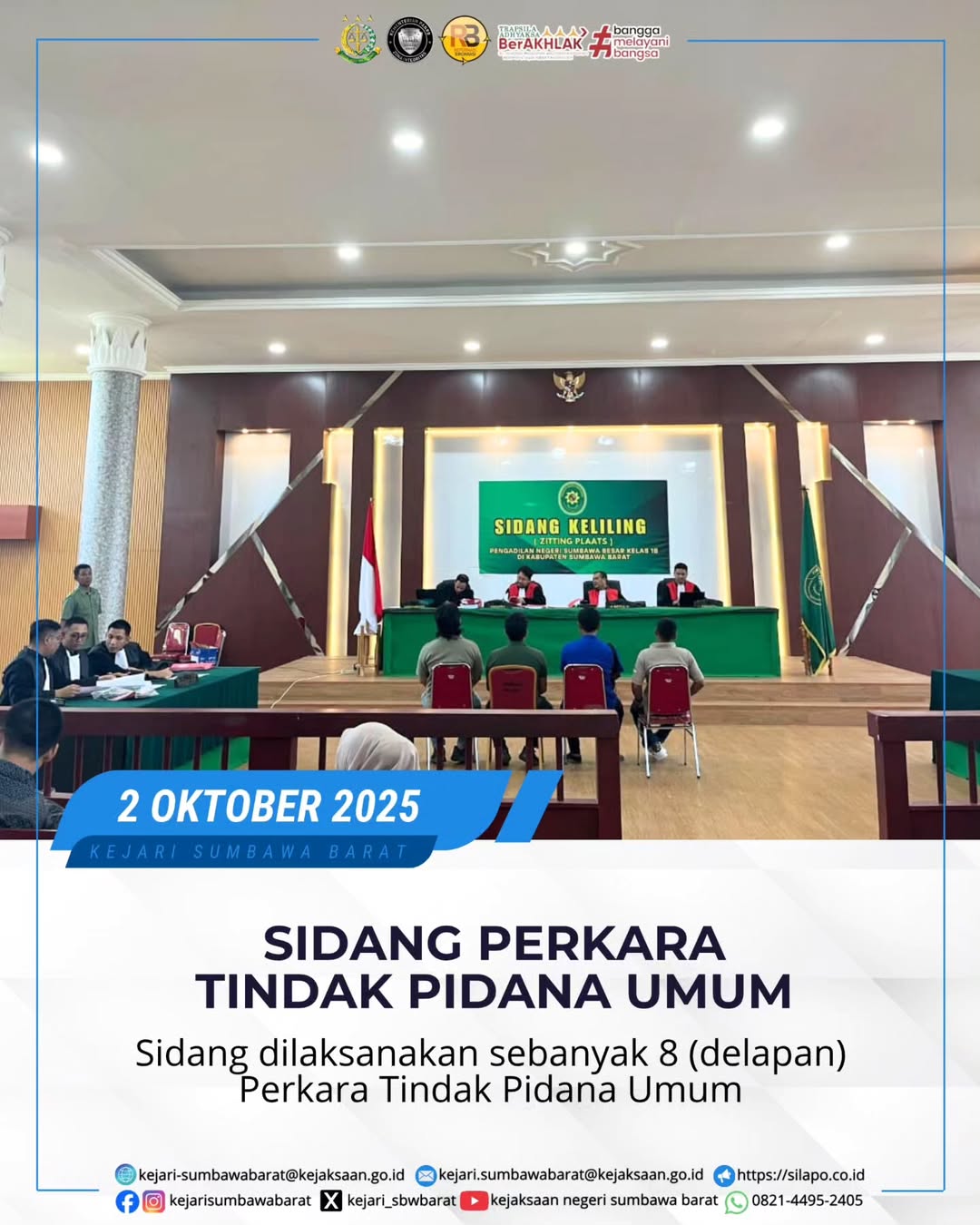 Pada hari Kamis , 2 Oktober 2025. Tim Jaksa pada Kejaksaan Negeri Sumbawa barat melaksanakan Sidang Tindak Pidana Umum yang dipimpin langsung oleh Pengadilan Negeri Sumbawa Besar sebanyak 8 (delapan) perkara.