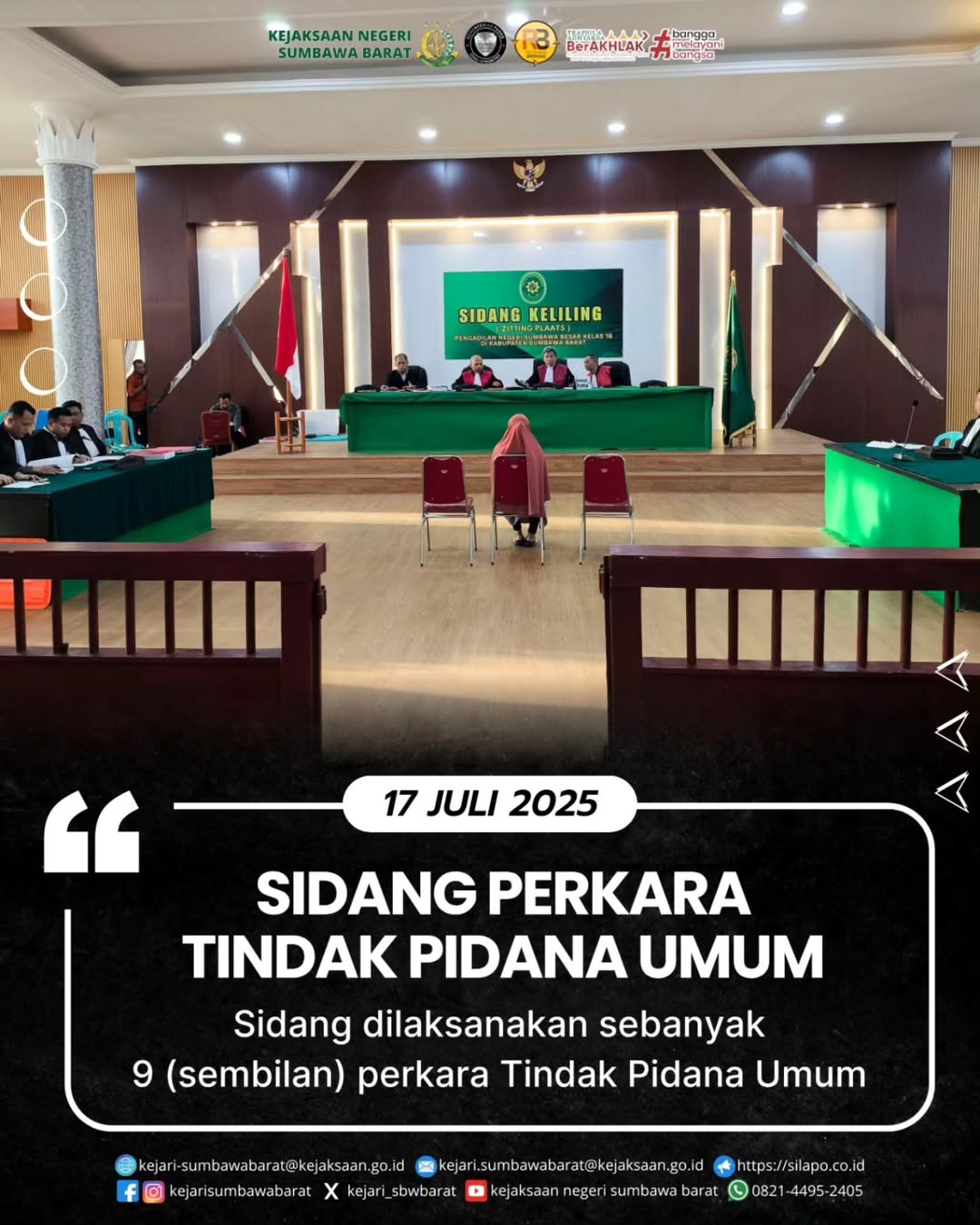 Pada hari Kamis, 17 Juni 2025. JPU pada Kejaksaan Negeri Sumbawa Barat melaksanakan sidang tindak pidana umum sebanyak 9 (sembipan) perkara.