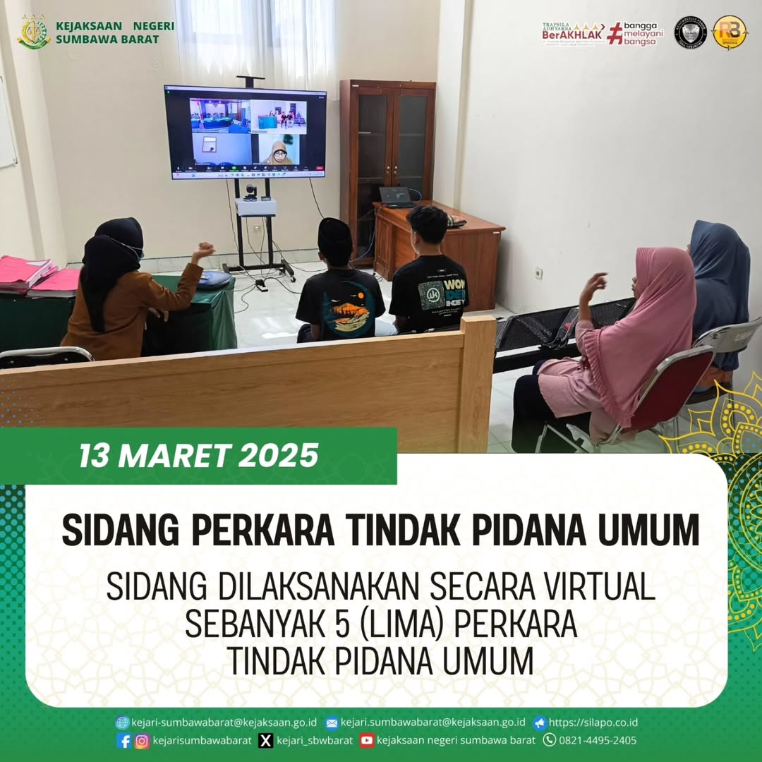 Pada hari Kamis, 13 Maret 2025. JPU pada Kejaksaan Negeri Sumbawa Barat melaksanakan sidang perkara tindak pidana umum sejumlah 5 (Lima) perkara yang dilaksanakan secara daring. sidang dilaksanakan secara daring sebagai hasil koordinasi Aparat Penegak Hukum (APH) terkait efisiensi anggaran.