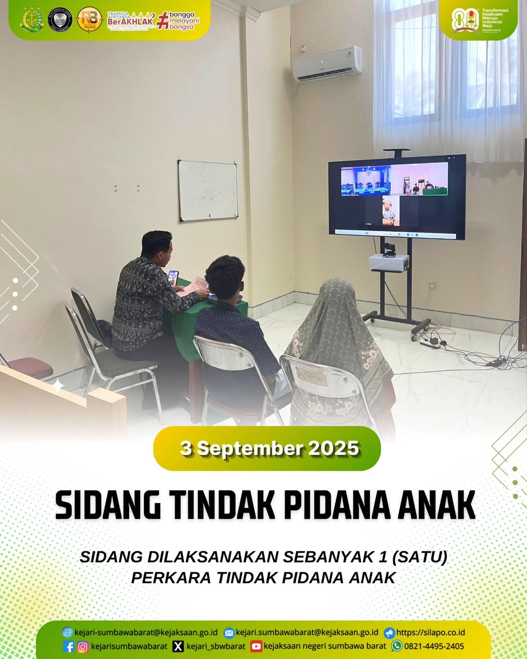 Pada hari Rabu, 3 September 2025. Jaksa pada Kejaksaan Negeri Sumbawa Barat melaksanakan kegiatan Sidang Secara Online di Kantor Kejari Sumbawa Barat yang dipimpin langsung oleh Hakim yang berada di Pengadilan Negeri Sumbawa Besar.