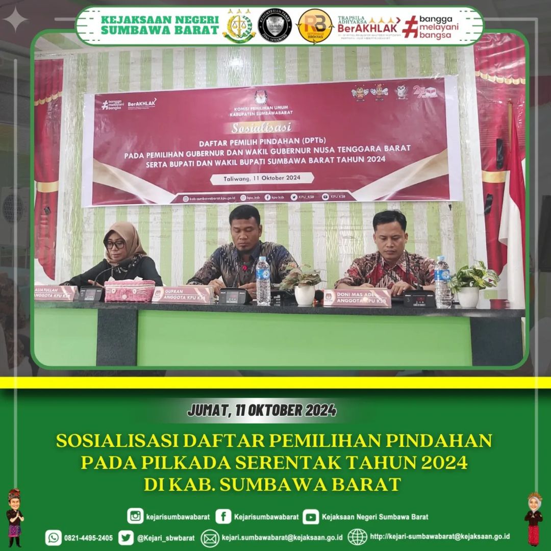 Jum’at, tanggal 11 Oktober 2024. Kegiatan Sosialisasi Daftar Pemilihan Pindahan (DPTb) Pada Pemilihan Gubernur dan Wakil Gubernur Nusa Tenggara Barat serta Bupati dan Wakil Bupati Kab. Sumbawa Barat Tahun 2024 yang dilaksanakan di Aula Kedai Sawah Resto Taliwang.