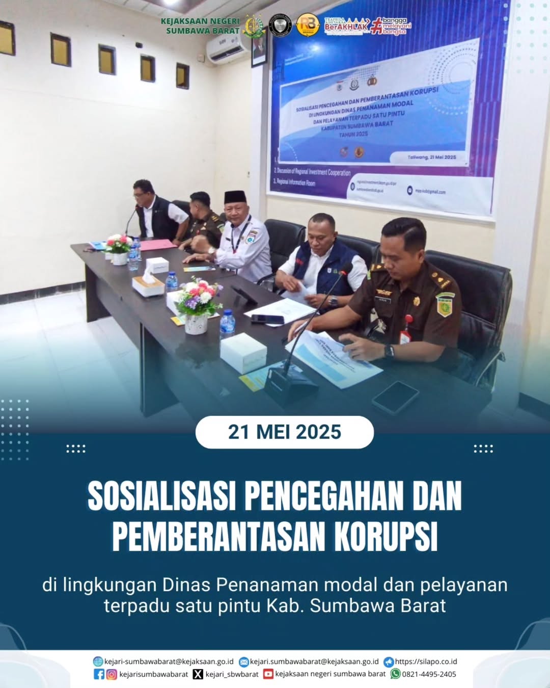Pada hari Selasa, 21 Mei 2025 Kepala Seksi Tindak Pidana Khusus, Lalu Irwan Suyadi, SH.,MH bersama tim pidsus menghadiri kegiatan Sosialisasi Pengaduan Masyarakat dan Siber Pungli di Aula Dinas Penanaman modal dan pelayanan terpadu satu pintu Kabupaten Sumbawa Barat