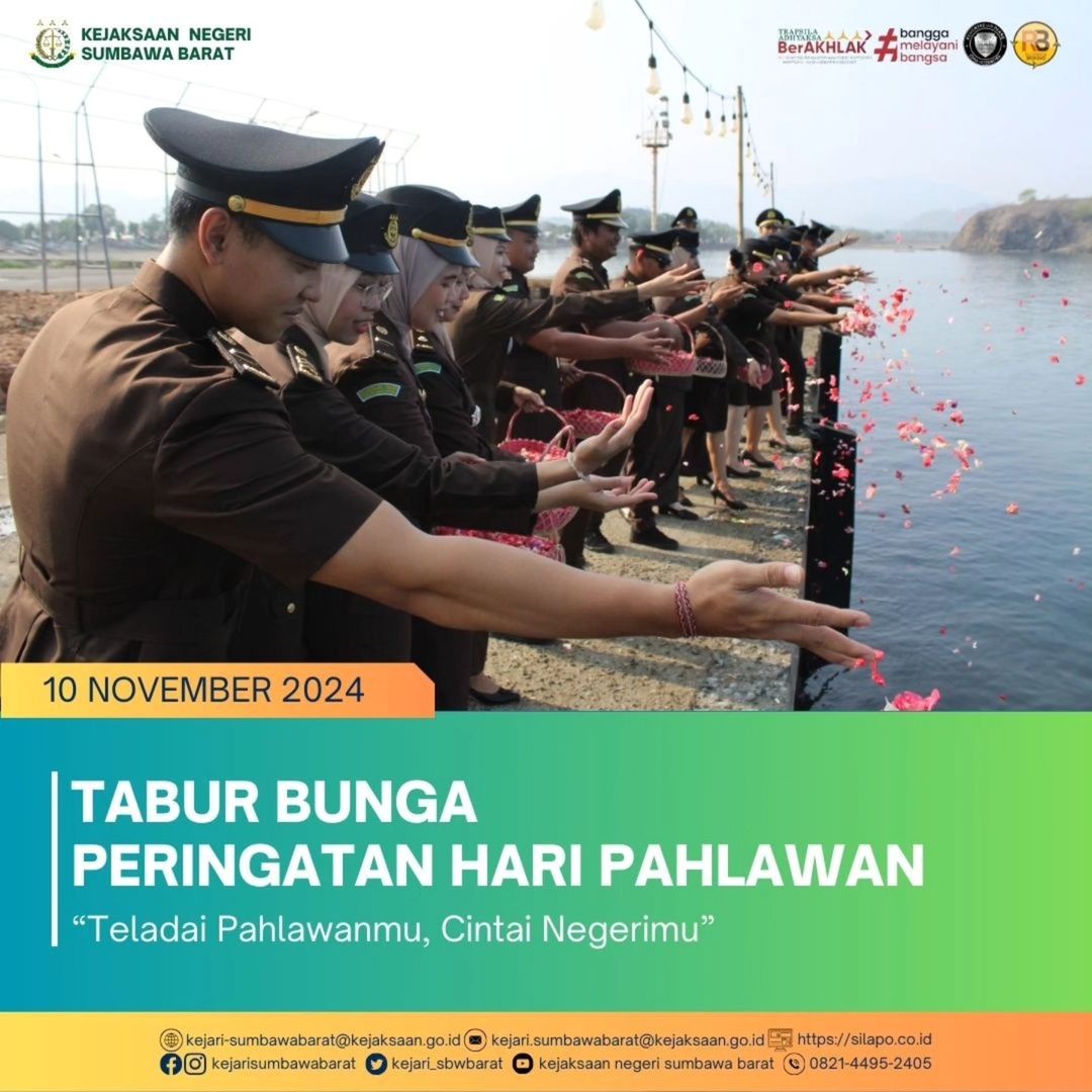 Pada hari Minggu, 10 November 2024 dalam rangka hari pahlawan Kejaksaan Negeri Sumbawa Barat menggelar upacara tabur bunga di laut Dermaga Pelabuhan Lalar. Tabur bunga di Dermaga Pelabuhan Lalar ini sebagai bentuk penghormatan kepada pahlawan yang berjuang untuk negara dan bangsa.