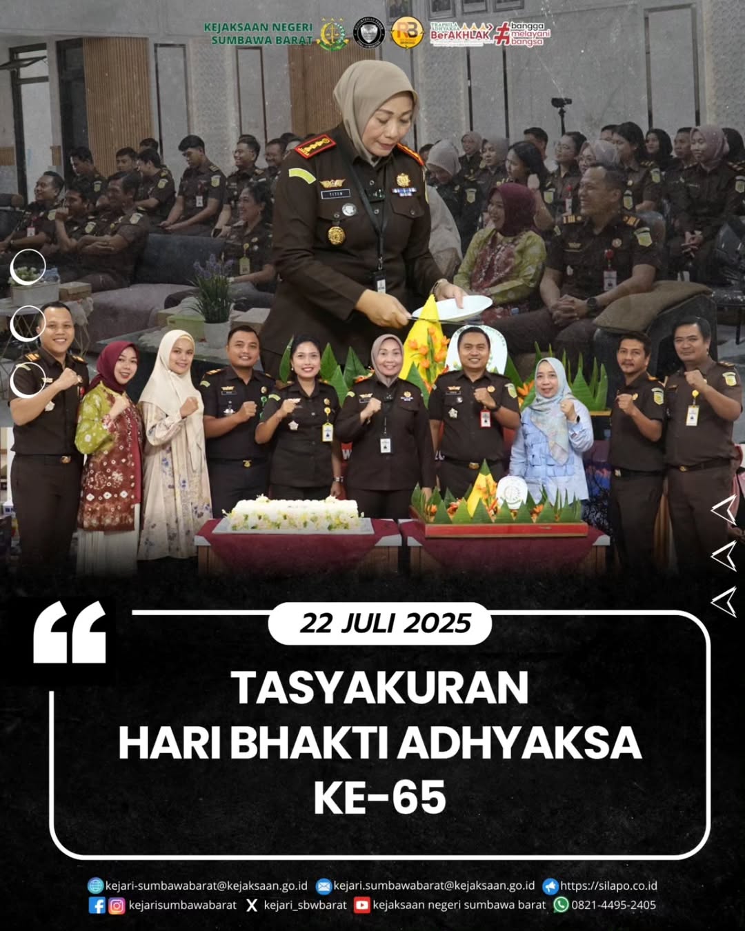 Pada hari Selasa, 22 Juli 2025. Bertempat di Aula Kejari Sumbawa Barat telah dilaksanakan tsyakuran dan potong tumpeng dalam rangka memperingati Hari Bhakti Adhyaksa Ke-65 secara sederhana diikuti oleh seluruh pegawai Kejaksaan Negeri Sumbawa Barat.