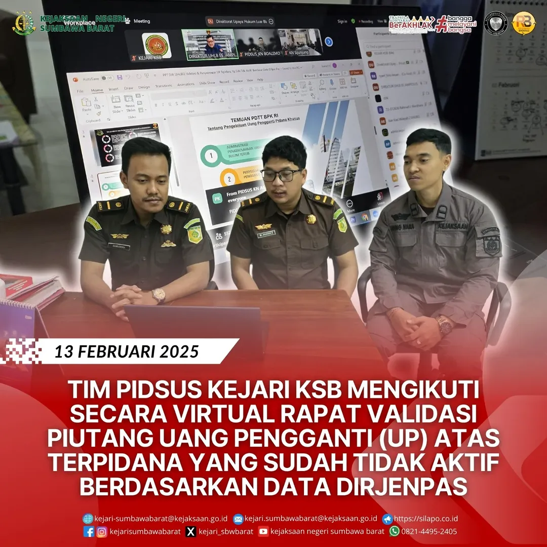 Pada hari Kamis, 13 Februari 2025. Staf bidang tindak pidana khusus mengikuti Rapat Validasi Piutang Uang Pengganti (UP) Atas Terpidana Yang Sudah Tidak Aktif Berdasarkan Data Dirjenpas. Rapat tersebut dilaksanakan secara virtual