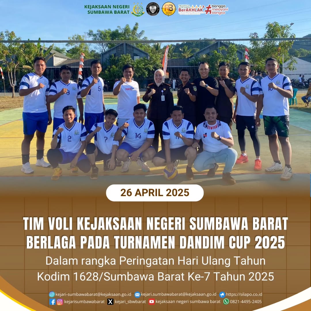 Pada hari Sabtu, 26 April 2025. Kejaksaan Negeri Sumbawa Barat ikut berpartisipasi dalam turnamen volly yang diselenggarakan dalam rangka Hari Ulang Tahun Kodim 1628/Sumbawa Barat. Kejari Sumbawa Barat menyiapkan tim volly adhyaksa untuk berlaga dalam turnamen tersebut.