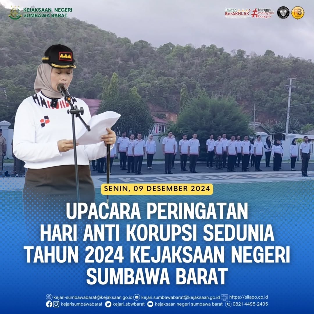 Pada hari Senin, 09 Desember 2024. Kejaksaan Negeri Sumbawa Barat melaksanakan upacara dalam rangka hari anti korupsi sedunia yang diikuti oleh Seluruh Pegawai dan PPNPN Kejari Sumbawa Barat serta turut hadir siswa siswi dari SMAN 1 Taliwang dan SMPN 1 Taliwang.
