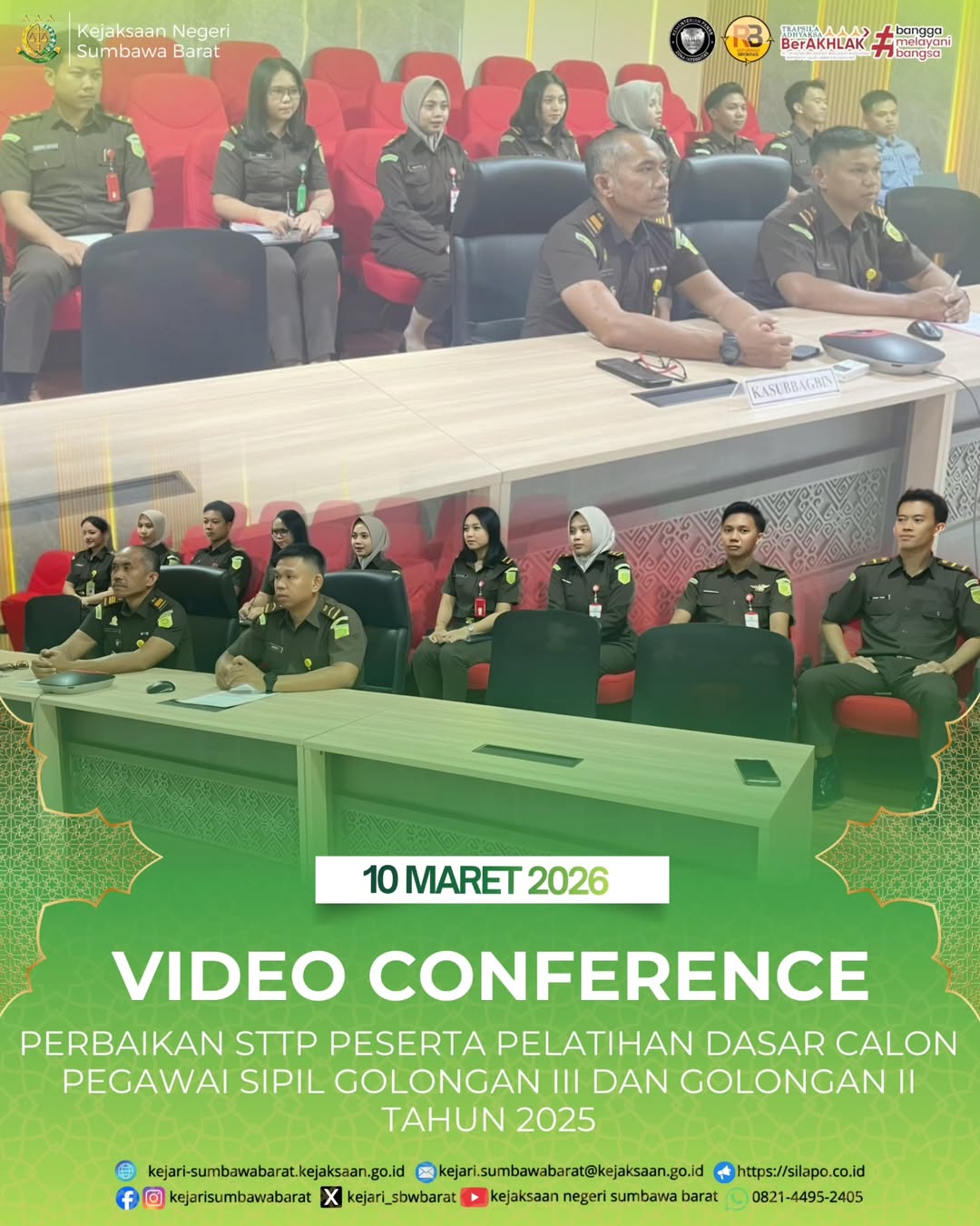 Pada hari Selasa, 10 Maret 2026. Kepala Kejaksaan Negeri Sumbawa Barat diwakili oleh Kepala Subbagian Pembinaan, I Gde Wisnu Guna Umbara, S.H beserta CPNS mengikuti video conference terkait perbaikan STTP peserta Pelatihan Dasar Calon Pegawai Sipil (CPNS) Golongan III dan Golongan II Tahun 2025 di Ruang Vicon Lt. 1 Kejari Sumbawa Barat.